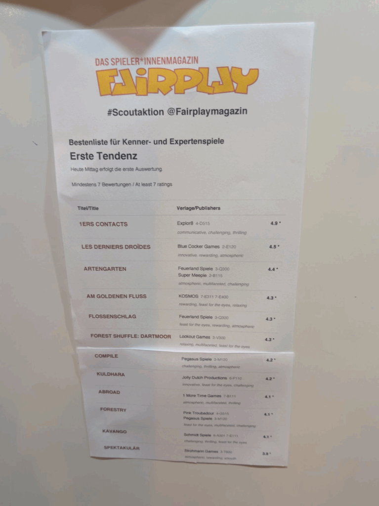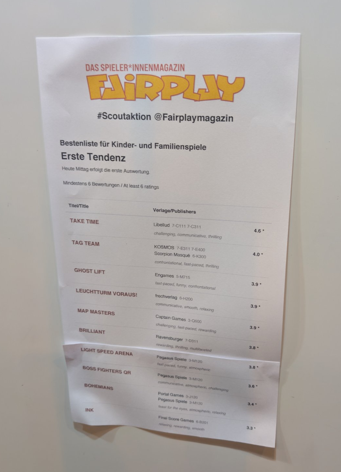 Même s’il n’a aucune valeur “officielle”, le Fairplay est très suivi par les joueurs, les éditeurs et les médias, car il reflète le bouche-à-oreille du salon, en d’autres mots, quels jeux font le plus parler d’eux ou enthousiasment les visiteurs.