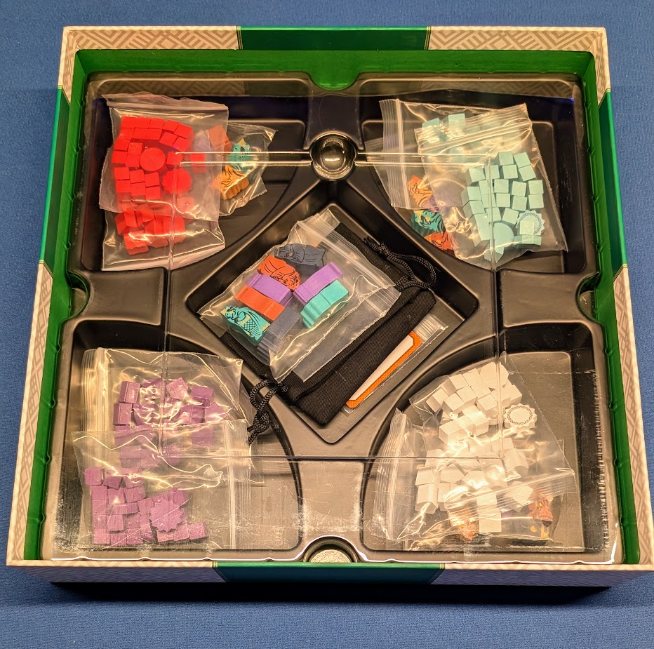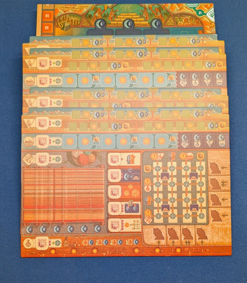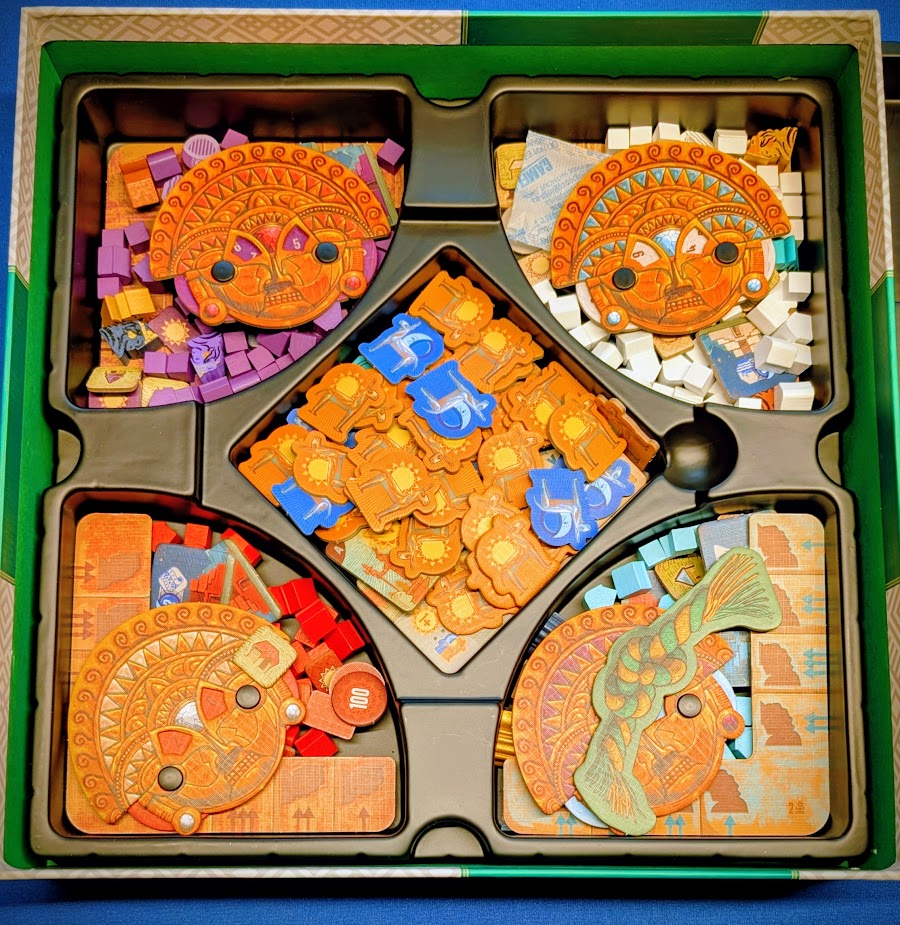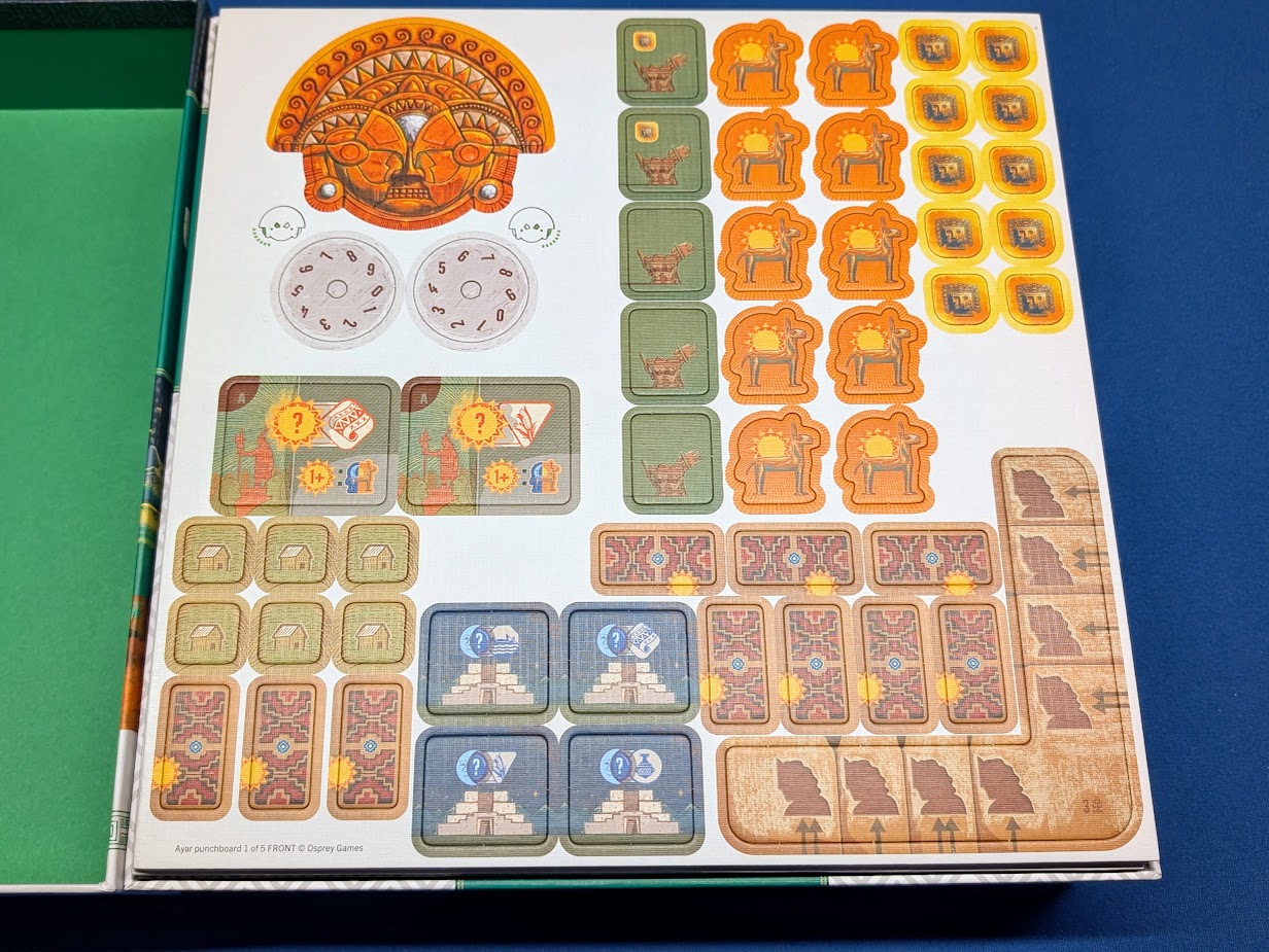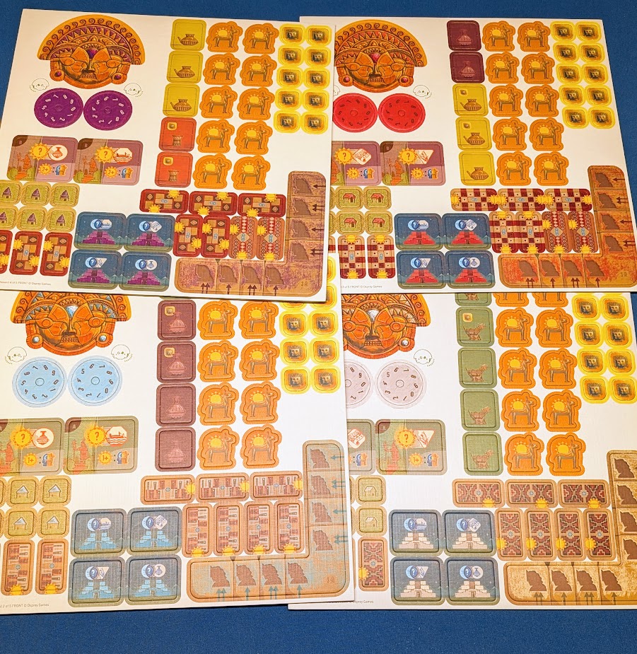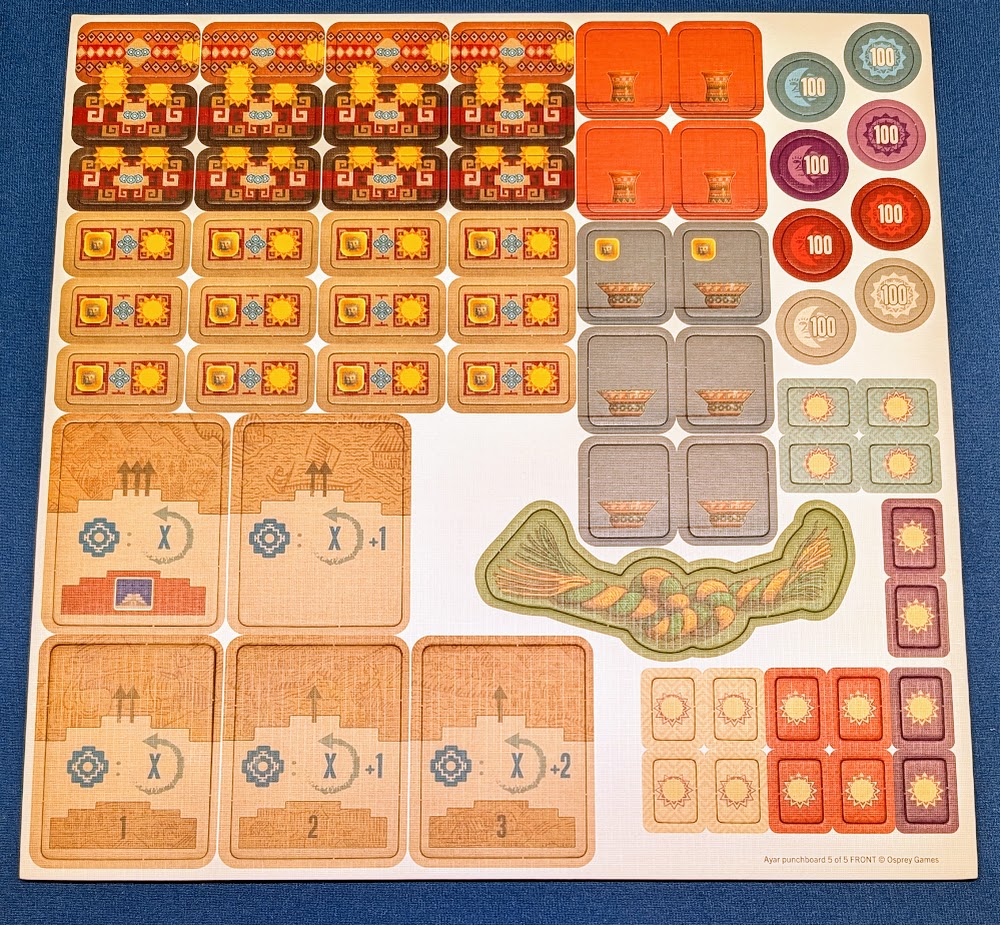 1 – Les Ayar, que l’on doit collectivement faire progresser sur différentes pistes. À la fin de chaque manche, un Ayar est retiré, ce qui peut vous permettre de marquer des points Lune, mais pourrait aussi vous priver de futurs points Soleil.