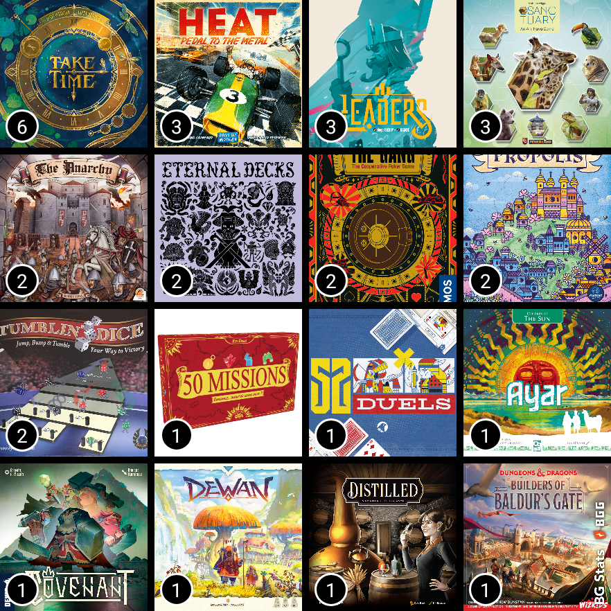 Heat, pas une nouveauté, mais ça faisait une bonne année qu’on ne l’avait pas sorti, pour faire une saison. Super le fun de choisir les améliorations de son auto, et de voir l’impact sur le jeu. C’est un jeu qui se joue rapidement, bien tendu, bonne interaction et souvent des choix déchirants. Souvent très serré dans les courses, à une manœuvre dans un virage près. Il n’y a pas de place à l’erreur. Le meilleur jeu de course sur le marché à mon avis !